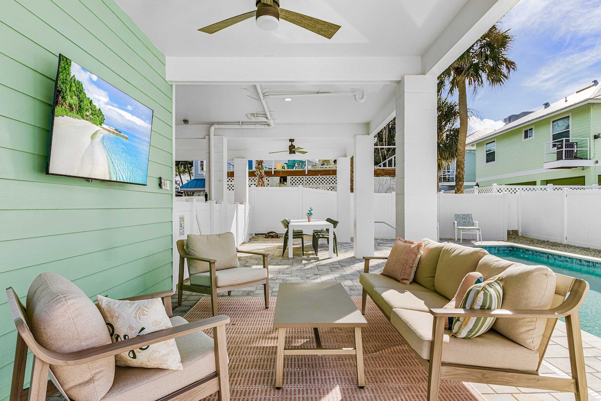 Personally hosted by Paul & Alicia of Dancing Palms Vacations, this brand-new home offers Gulf views from the front porch—just steps from the white-sand beach. The 3BR/2BA retreat sleeps 8 with 2 KING bedrooms, a private heated pool, and a fenced outdoor living/dining area with TV and boutique coastal hotel vibe. Enjoy all-new furnishings, games, and beach gear. Open-concept living/kitchen/dining with 85” smart TV. Family-friendly and walkable to bars, restaurants, shops, and the marina.