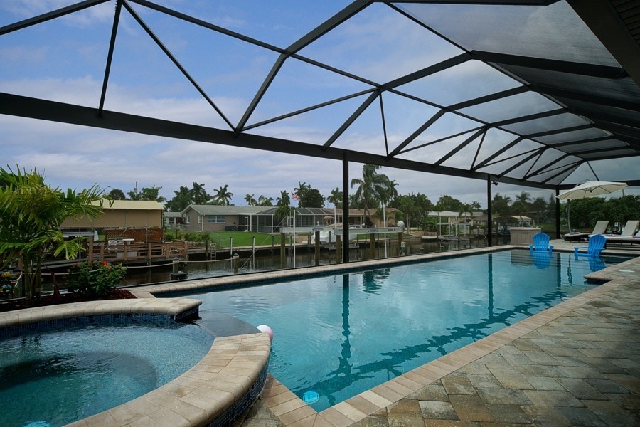 Villa Blue Sky is located in a quiet and beautiful area Central in Cape Coral that allows to be very fast everywhere (Neighborhood Walmart, Publix, Restaurants like Lobster Lady, Duffy’s and much more and the Library). The villa is surrounded by a beautifully landscaped, with a “hang out” area and fenced in garden, which granted enough privacy. Already in the morning you can enjoy the sun on the spacious south facing pool terrace.