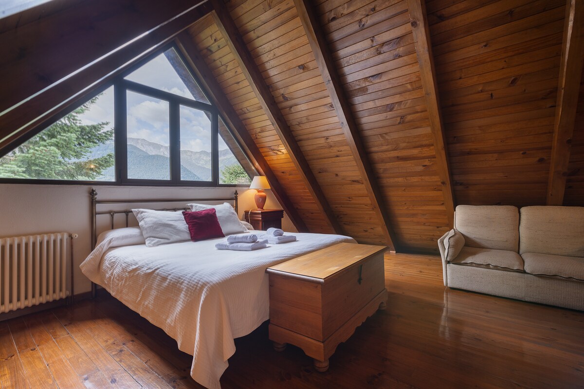 Take it easy at this unique and tranquil getaway. The old rectory offers fantastic views towards the Port Ainé ski station and over the Norguera Pallaressa river valley. Ideally located just 20 minutes from the Aiguestortes national park, 15 minutes from Esterri d'Àneu and just 10 minutes from the bars, restaurants and supermarket in Llavorsí. This eco-friendly house with its solar panels and biomass stoves is recently renovated combining original features and modern living.