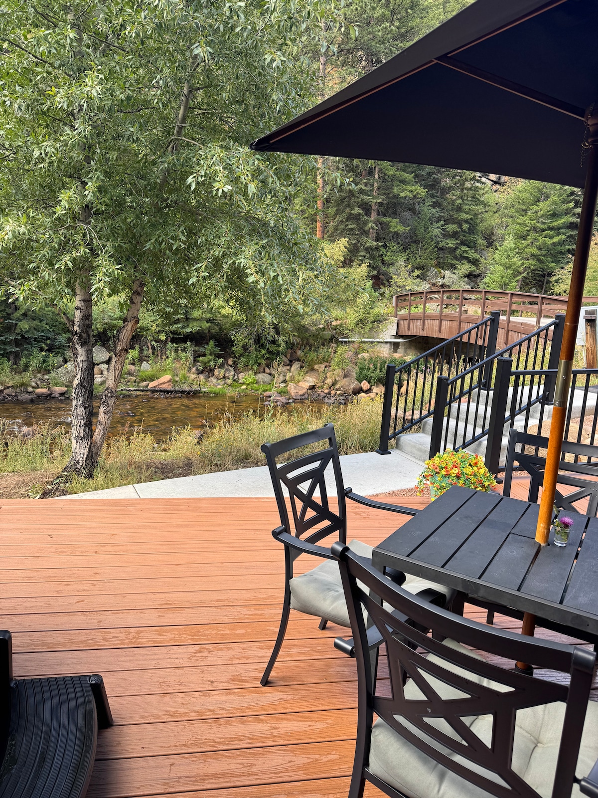 Remodeled 1st floor condo with a calming and serene view of the river from your back patio (STR #3395)! Located between Downtown Estes and Rocky Mountain National Park. Take the free summer trolley for easy access to shops and restaurants or head into RMNP for hiking and animal sightings. Estes Park hosts special events such as: concerts, wine/chocolate tastings, the Scottish Festival, and more, so book your getaway accordingly!