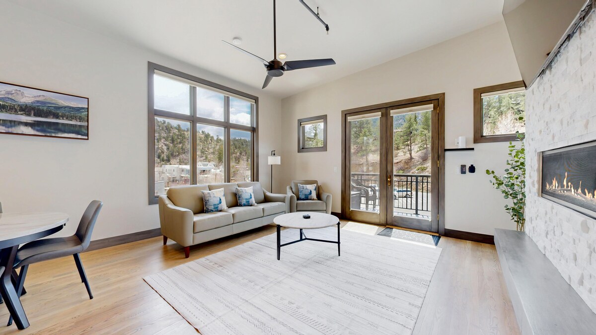 Enjoy this beautiful end unit retreat on the bank of Fall River, minutes from Rocky Mountain National Park and downtown Estes Park, Permit 6224. Features rustic wooden ceiling, bright modern interior, and private hot tub with river views. + Private hot tub + Fishing in the river + Cozy fireplace in open-concept living area + Kitchen w/ skylight and dining nook + King bed, tiled shower + Laptop-friendly workspace A perfect basecamp for exploring Estes Park and RMNP, just steps from Fall River.