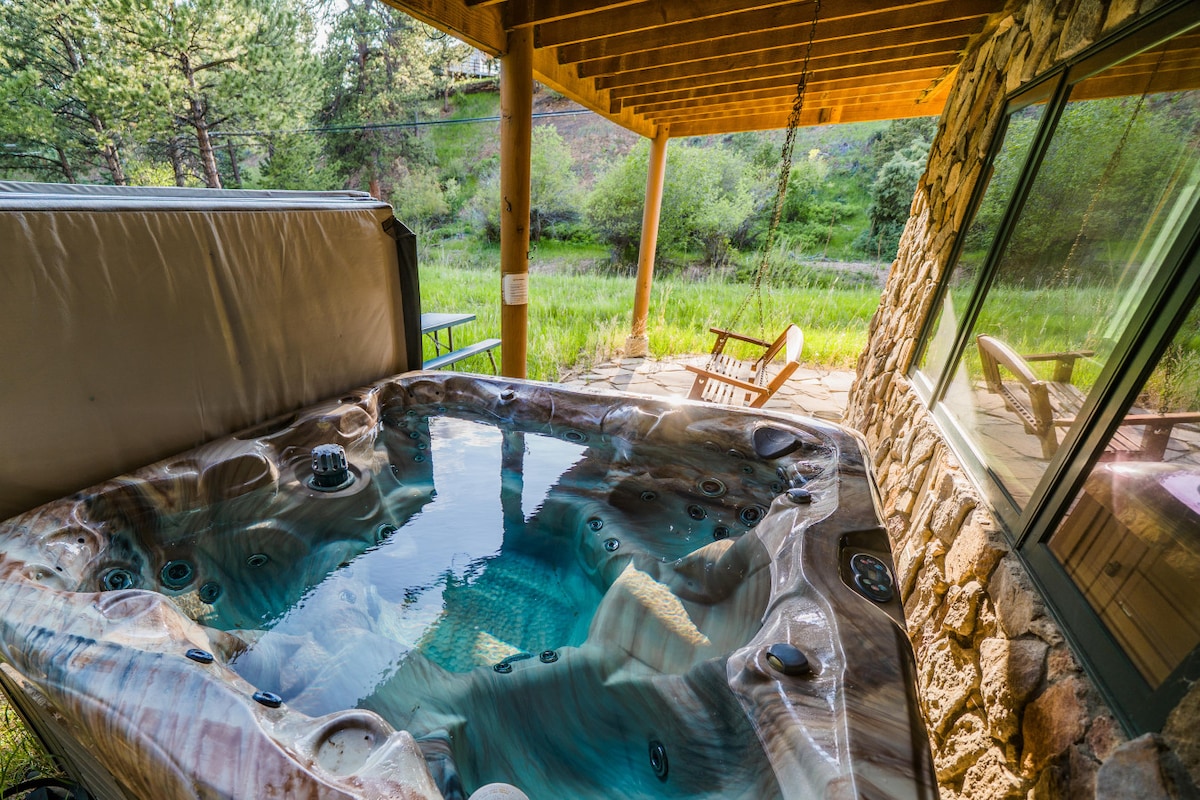 A perfect couples retreat! Hike into Rocky Mountain National Park from the front door, soak in a private hot tub, enjoy a wood stove, charge your car & stargaze beneath a skylight from a luxe king bed (21-ZONE3143). "By far the best Airbnb we have stayed at" - Allison A block from the park boundary (elk abound) & 5 mins to town. + Eco-friendly AC & heat + EV charger (220V) + Wood stove + Beetle kill woodwork + Big kitchen, laundry + Mood lights + Walk in shower Zen studio for 2, circa 2023