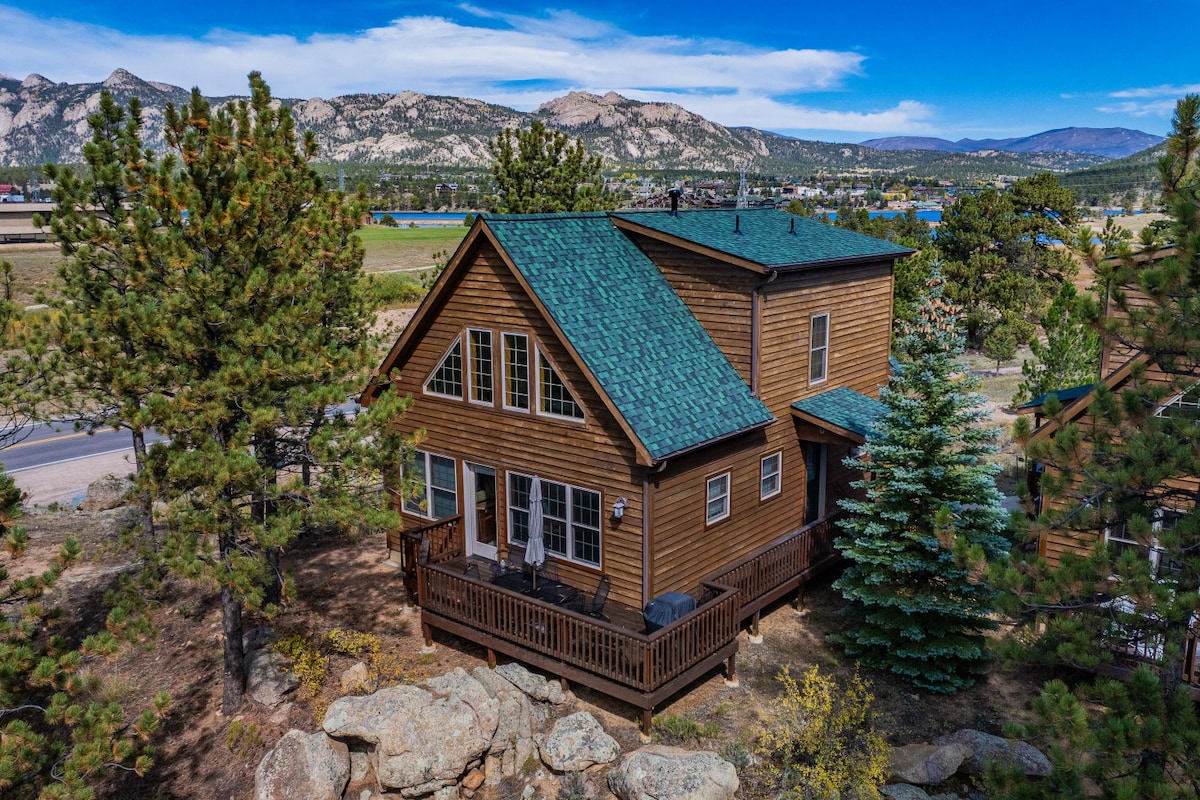 Pets, EVs & hot tub lovers invited! Enjoy sunsets over the National Park's peaks from our modern cabin's deck (permit 22-ZONE3285). Minutes to Rocky Mountain National Park & w/ an EV charger. King master suite, open dining/living area, kid's play loft, queen bedroom & 2nd bath. The sofa bed in the living room accommodates 2 more. - Private hot tub - 1 gig Internet for work - Charge your car! - Marys Lake nearby (fishing!) Great for families up to 6 (6 max including infants and children)