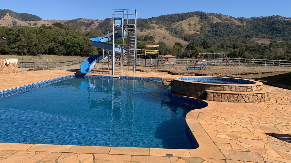 Chácara Paraíso em Estiva-MG. Linda chácara para até 24 pessoas (incluindo crianças), com 6 suítes disponíveis, 2 cozinhas, salão de festas e salão de jogos. Piscina adulta e infantil, campo de futebol, playground e muito mais diversão para sua família e amigos. Fique maravilhado com as paisagens, aproveite o contato com a natureza e esqueça a loucura da cidade grande...