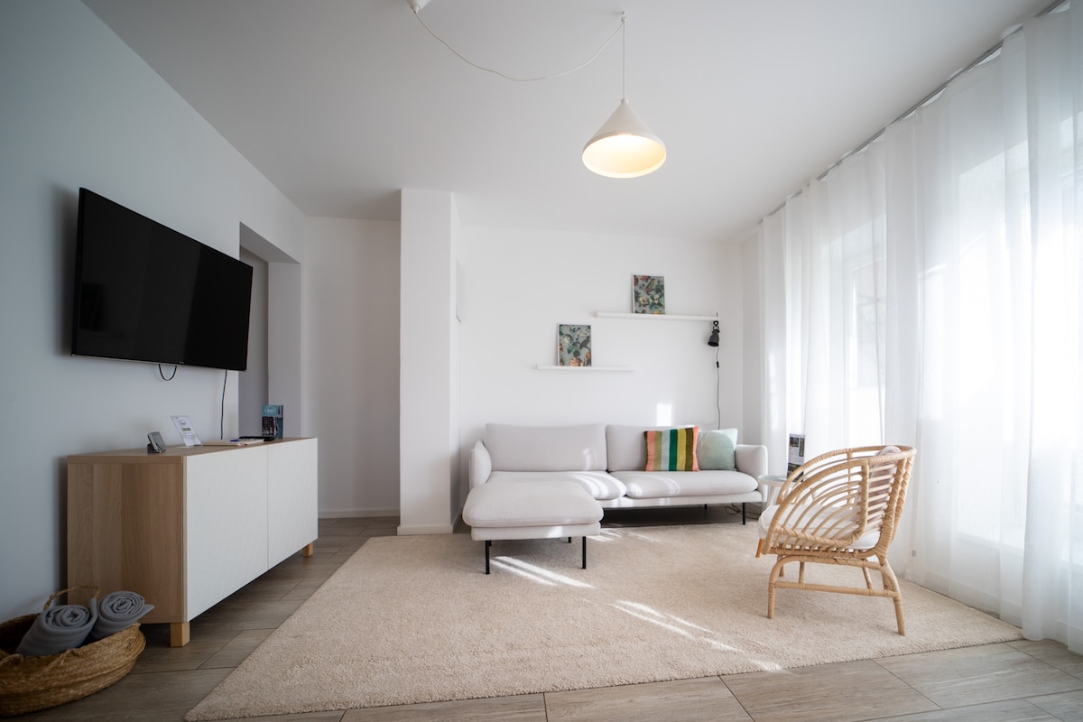 Enjoy your stay at a stylish home with unique architecture inside and on the exterior. Apartment is located at the heart of artsy district that includes the best restaurants, cafes and is just 2 min walk to the Old Town. Sea view from your balcony. Enjoy the local vibe :) Apartment is set up by a cleaning team. Includes sheets, towels and essentials. Sofa bed is included in price for 3-4 people bookings. If booked for 2 persons the sofa bed is for extra cost. Contact us for more details :)