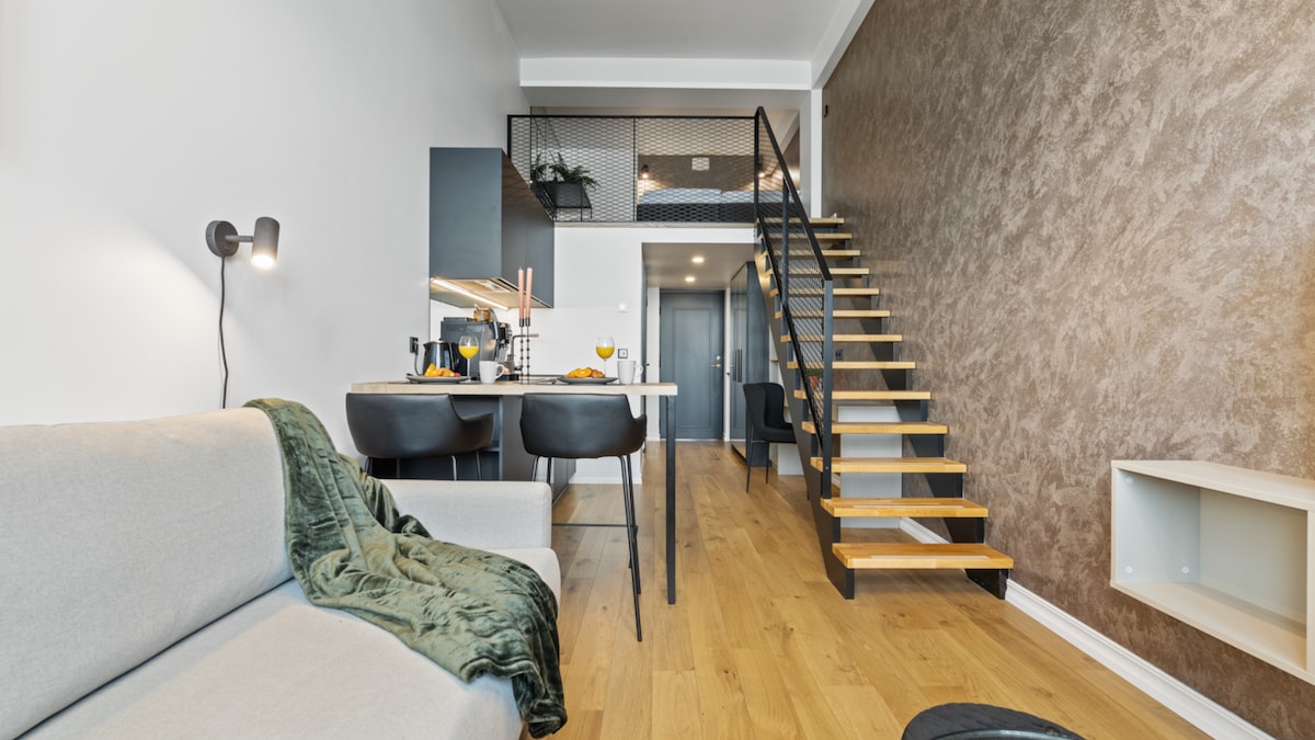 • 1 bedroom apartment • 180 cm-wide king bed • Additional sofa bed • Sleeps 4 people • Balcony • Climate-neutral & double carbon offset • 47-55 m2 • Kitchen • Air ventilation with cooling • Shared laundry facilities • Regular professional cleaning • Local gym access included • Yoga mats & online yoga studio access included • Contactless access • Early check-in & late check-out (on request) • Fast WiFi • Smart TV • Free luggage storage • Baby crib available