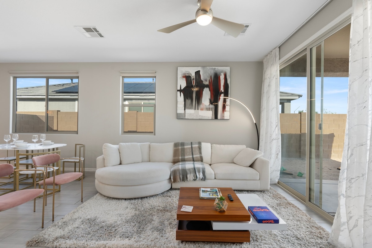 Welcome to the Coco Cabana! Come relax at our 3+ bedroom home located on a quiet street in sunny Estrella Mountain Ranch in Goodyear, AZ! There is a fun happy vibe around every corner with Insta worthy murals and retro Palm Springs decor throughout. Throw some meat on the bbq, bevies in the pink cooler, get your coozie, lets go! Float in the pool, play some putt putt and cornhole or relax in the jacuzzi and cute cabana! Movie room with huge sofa bed, Dining for up to 10 people! STR#STR0000344