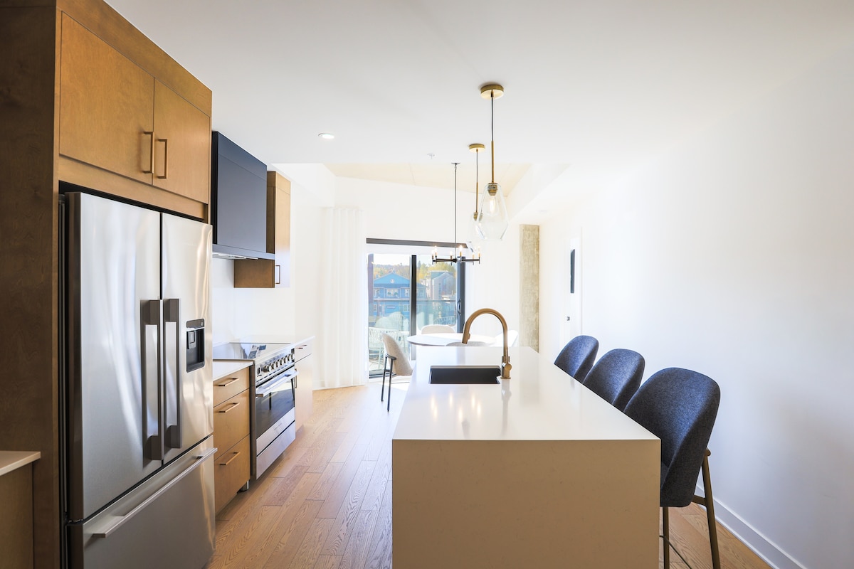 Suite 2 chambres spacieuse alliant style et confort, avec lit King, cuisine complète et balcon. Son emplacement permet de profiter autant des attraits naturels du lac que de l’animation du centre-ville. Les chiens NE sont PAS acceptés dans cette suite. Les chiens sont permis seulement dans les suites du 1er et 2e étages. Vous serez à proximité immédiate des restaurants, cafés et activités du centre-ville.