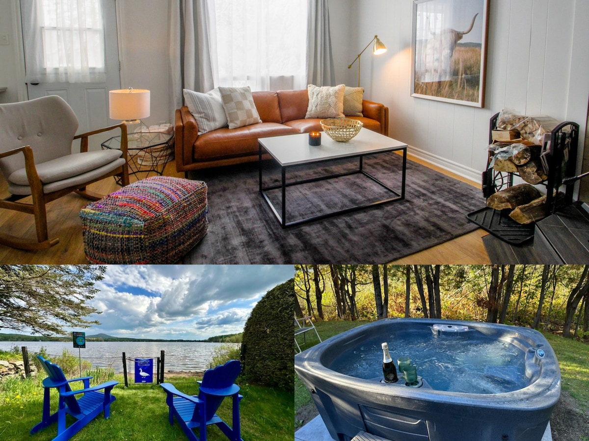 Accueille 4 personnes Cuisine tout équipée. Foyer au bois, tv intelligente 50 pouces, wi-fi chambre lit queen + lit en mezzanine . Vignobles, restaurants, cafés, buvette, dépanneur, parcs, terrains de golf, pistes cyclables, microbrasserie Accès privé au lac l’Écluse idéal pour paddle board 1 km Parc national du Mont Orford:vélo, sentier, raquette 5 min. des pentes de ski du Mont Orford (SEPAQ) 10 min. du Memphrémagog SPA Manoir des Sables Parc de la Rivière aux Cerises à proximité