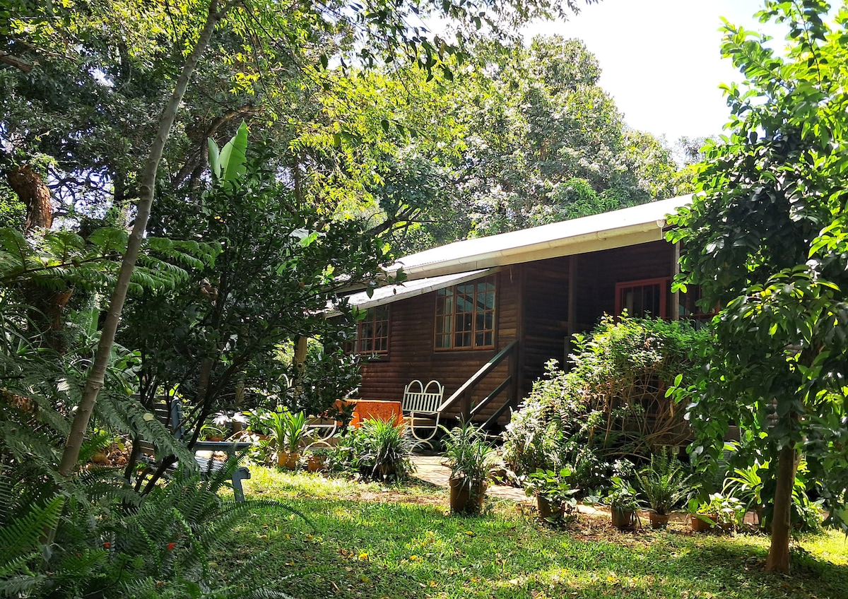 Our cosy cabin which sleeps 4 is set under the trees in our beautiful permaculture garden. It's a short drive away from shopping centers, restaurants, game parks and hiking trails. It's next to our art gallery & main house but with a back garden for you to relax in. We have a pool too! We love animals and hope you do too, there's a lot of friendly cats and big dogs around along with birds and monkeys! Kids can bring their own T-shirt and screen-print it with us for free at our workshop.