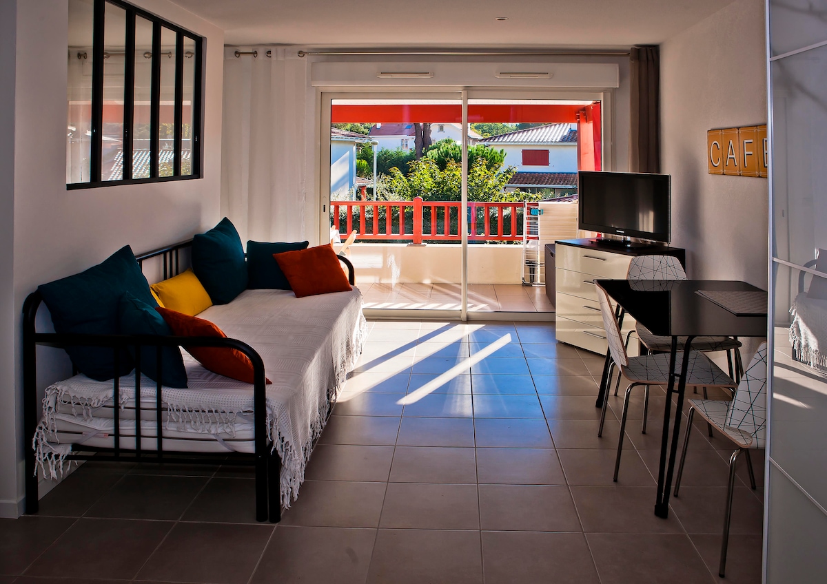A quelques pas du centre-ville, entre plage et forêt, au 1er étage d'une petite copropriété : Grand studio "duplex", lumineux et refait à neuf, avec espace couchage à l'étage Vous pourrez profiter d'un espace extérieur aménagé (table-chaises de jardin) dans la cour de la copropriété 2 vélos adulte à disposition, (+ siège enfant vélo, lit parapluie, chaise bébé en prêt sur demande) pour des vacances réussies ! Au rdc: 1 canapé lit 140cm, à l'étage: 2 lits 80cm ou 1 lit 160cm