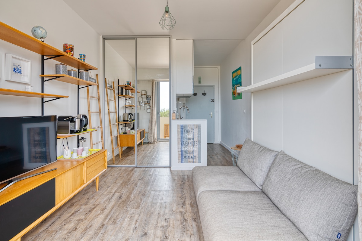 A louer T1 de 35 m2 à Vieux Boucau les Bains à 100 mètres de l’océan ( plage centrale) avec jardin clôturé de 35 m2. Appartement neuf climatisé, entièrement équipé pour accueillir 4 personnes. Un coin nuit avec lit superposé 3 personnes (bas en 140 et haut en 90). Canapé lit en 140 dans la pièce principale. Draps fournis. Un abris jardin est à disposition pour stocker vos vélos. Place de parking privative.