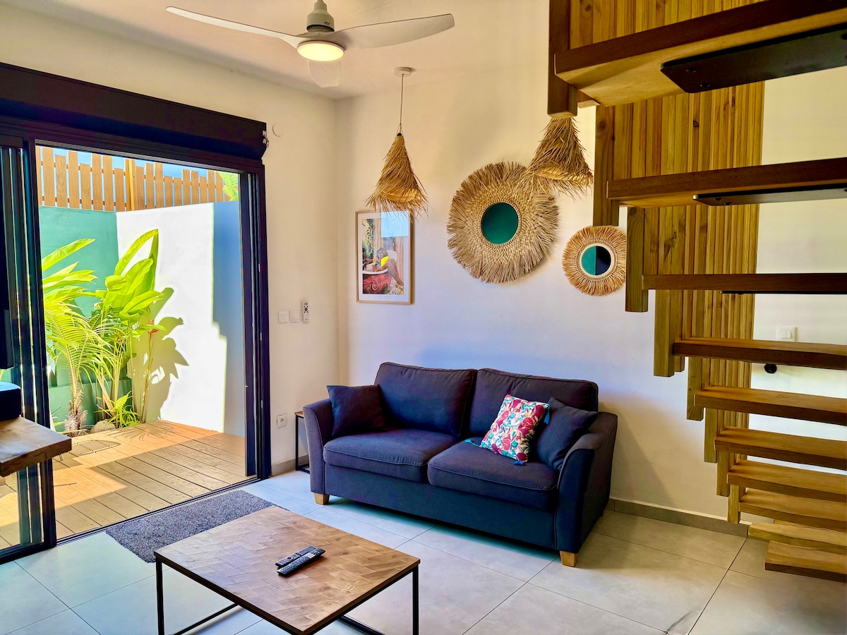 Villa Salba is an architect-designed contemporary bioclimatic style villa built in 2023. Built on land originally on a very steep slope, it benefits, like an eagle's nest, from magnificent panoramic views of the coastline up to the surroundings of the volcano. The villa is made up of two completely independent accommodations, Aloes (T2) and Vacoa (T3). Each with garden, terrace, balcony and panoramic views. Ideally located -3 minutes by car from all amenities and 10 minutes from the beach.
