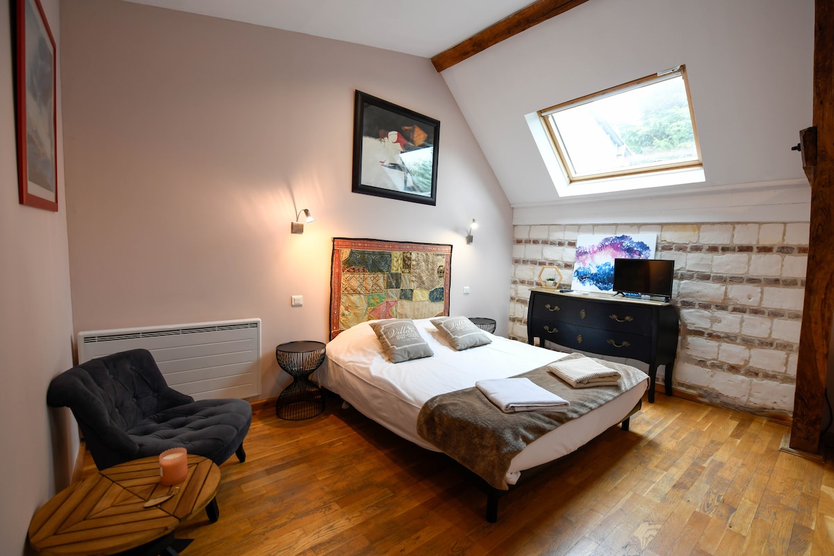 Je vous présente cette mignonne chambre privative située au 1er étage dans un corps de ferme à 14 km du Crotoy et 19 km de St Valéry sur Somme en Baie de Somme. Avec son parc de 2 ha 50 et ses arbres vénérables, ses lieux de méditation... Notre lieu vous apportera paix et sérénité. La chambre est équipée pour votre plus grand confort d'un espace "kitchenette". Wifi gratuit. Télévision. Dans le parc, profitez d'un salon de jardin dédié. Barbecue sur demande. Parking près de l'entrée.
