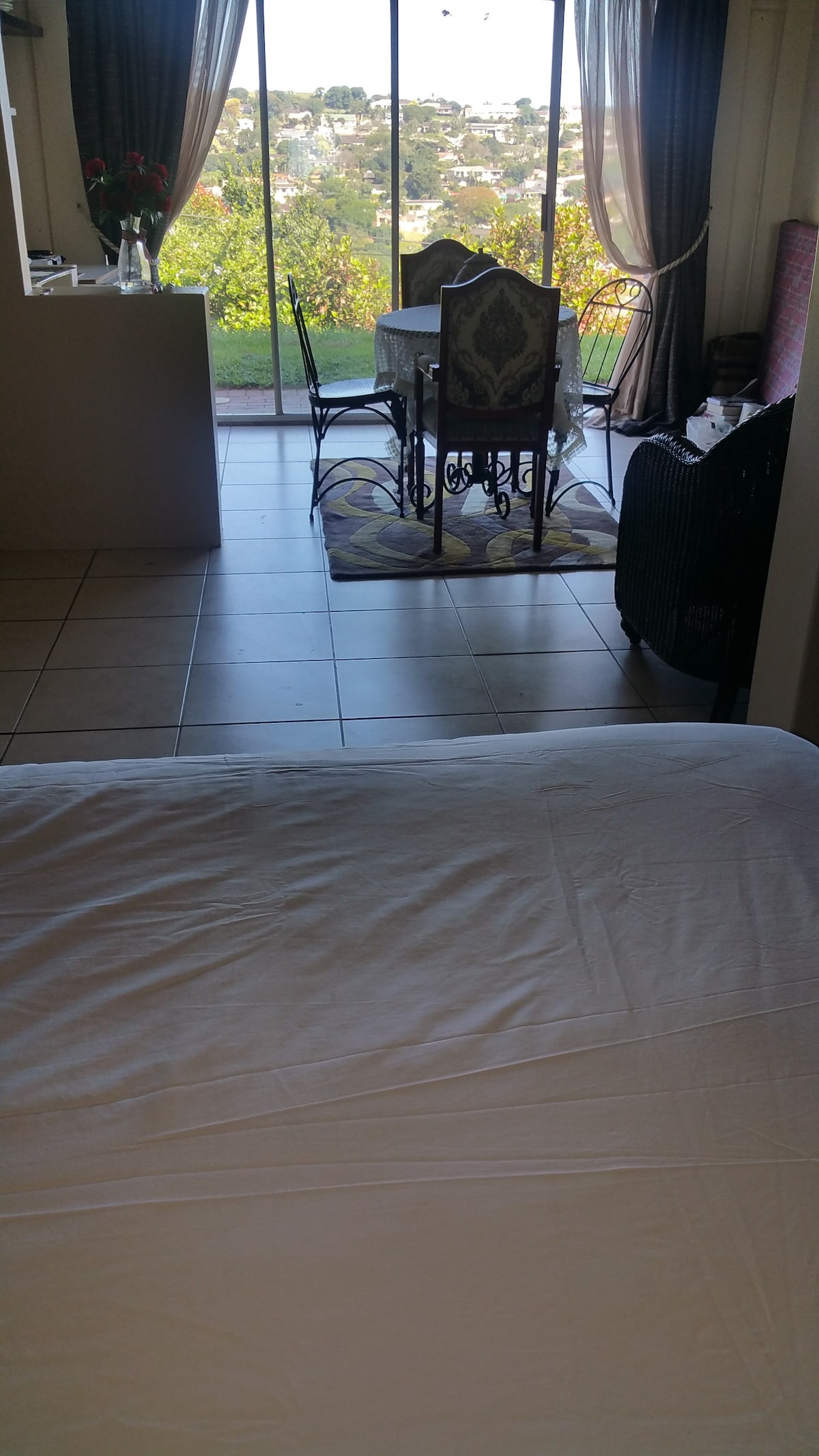 Our Beautiful Self Catering studio is situated on our property and is very private, comfortable with amazing views. It has full DSTV, Wifi, Aircon, Secure Undercover parking, Pool, and a Private entrance. Close to Shopping Malls, Restaurants, Beaches and is 15 minutes drive from King Shaka International Airport. We provide tea,coffee,milk, yogurt and muesli. The kitchen has, a mini oven, microwave, kettle,fridge, toaster. We can accommodate a YOUNG CHILD Only, NOT 3rd ADULT on a small bed!