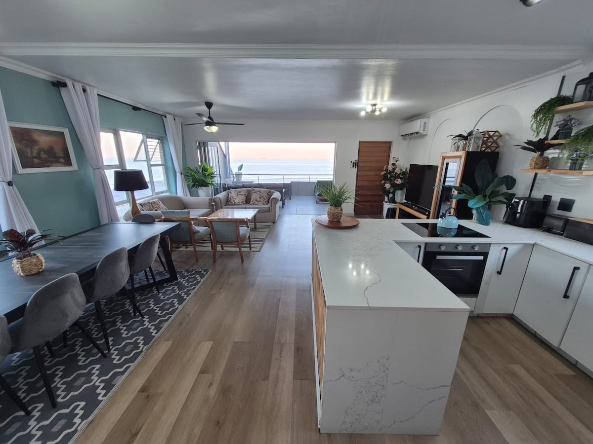 Stunning sea view Umdloti self catering apartment for long weekend/holiday rent. Sleeps 2 adults, fully kitted kitchen, dstv, aircon, 24/7 security, pool, patio sea view, Braai. Walking distance beach , nature reserve ,lagoon, shops, garage and restaurants. 8 mins from Umhlanga village, 5 mins King Shaka Airpot. Sea view and patio with gas Braai. Snorkeling swimming fishing bay safe for kids. Pet friendly too
