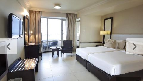 Deluxe Sea Facing Twin Room. Enjoy a comfortable stay with a private bathroom, balcony, free WiFi, and an electronic safe. Relax with 21 DSTV channels on a smart TV and stay connected with an in-room telephone. Each room features a private desk, air conditioning, a hairdryer, and a mini fridge. A kettle with complimentary tea and coffee is also provided. Parking options include ample free street parking or limited onsite parking at ZAR100 per day. The room is 34m², accommodating up to 2 people.