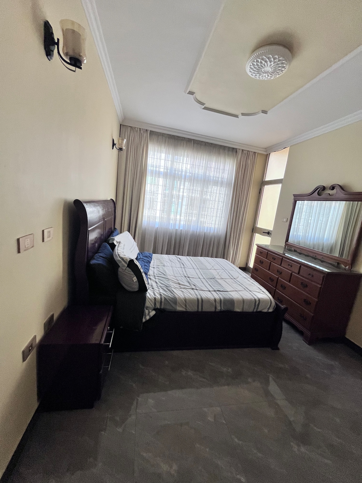 Great location 5 min away from Addis international airport. Center or 22 megenaga. Easy transportation availability, peaceful, 24/7 security and surveillance camera outside your door. Patio vies from 7th floor with bar and stool. Interior modern Decorated and furnished. Kitchen counter, microwave, stove available. Huge living room with WI-FI & TV and dining room table and fancy chairs enough for six family members. Bathroom with an enclosed hot shower Master bedroom a patio view of the city