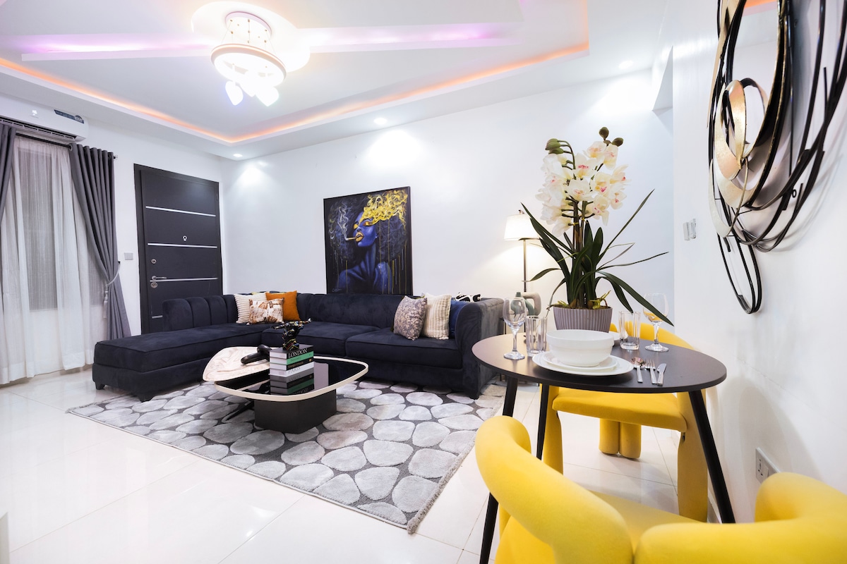 " Beautifully furnished 2 bedroom apartment located in a gated and secured environment within Lekki. Equipped with smart tvs (Alexa, Netflix and amazon prime), unlimited internet, 24 hrs power supply/Solar, DSTV premium, Ring video bell, fully air conditioned, water heaters, card/board games, parking space, fully equipped kitchen with microwave, refrigerator and kitchen utensils, washing machine, house keeper and/or in chef on request". We are here to give you a home away from home experience