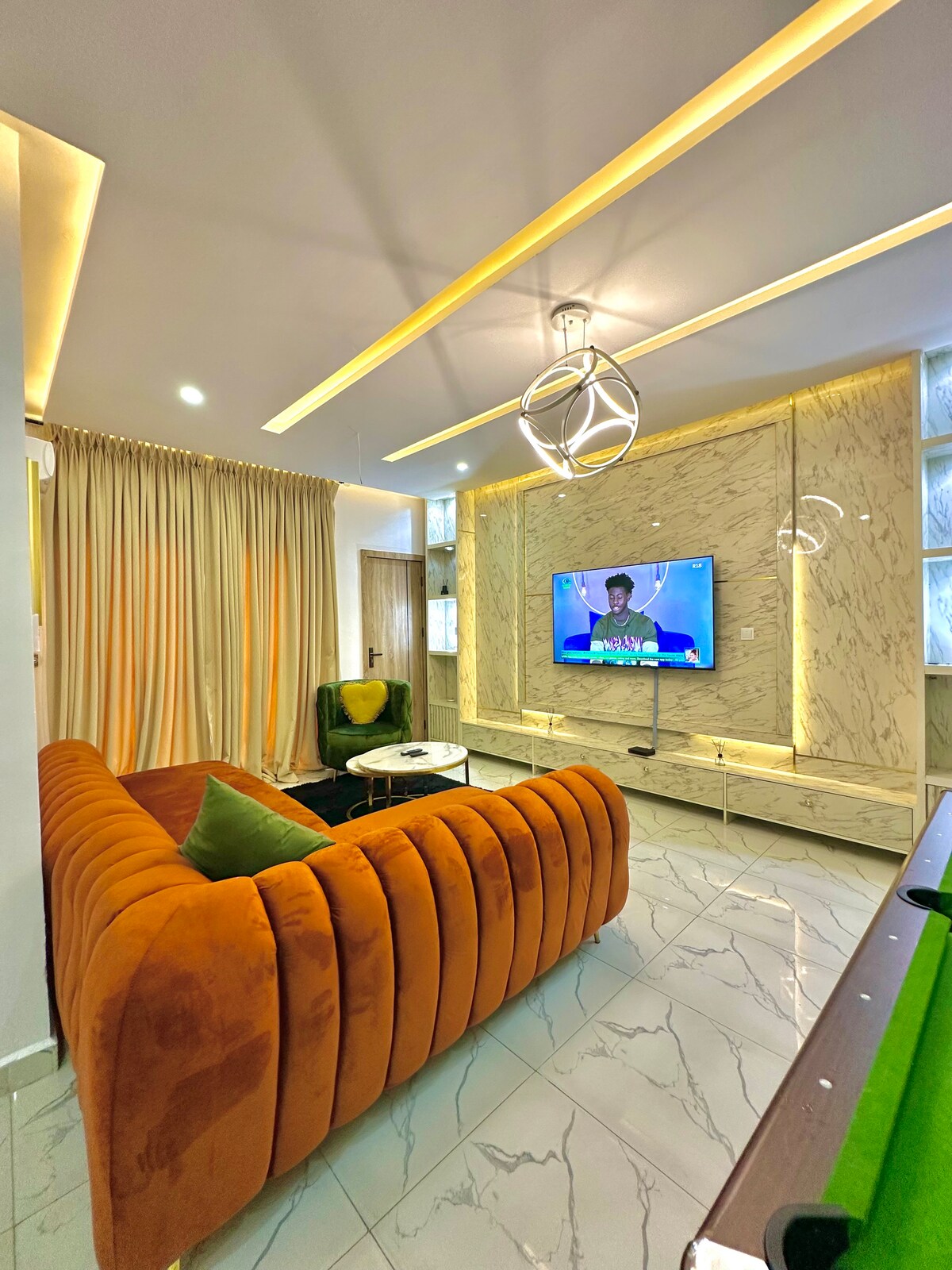 Welcome to Elmstead Luxury Aprt , your stylish retreat in Lekki Ikota. This 2BR/2BA haven offers A/C comfort, a 65″ TV in the living room, 43″ TV in bedrooms, free stable unlimited Wi-Fi, and 24/7 power with inverter & solar. Enjoy smartlock self check-in, free parking, an in-unit washer, and a kids’ bouncing castle. 1 Free cleaning for stays over 5-6 nights. Close to Lekki conservation Center, Mega Chicken, Blackbell & Blemco. perfect for solo travelers, business guests, families, or long stay
