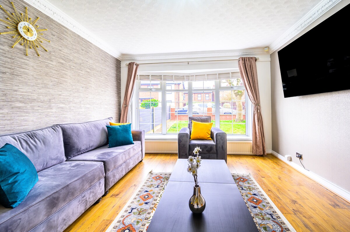 What do people love about our place? - Pac-Man Machine - Dart Board - Smart TVs in all bedrooms - 50" 4K Smart TV with Netflix - High-speed WiFi (160mbps) - 8 mins into the City Centre - 2 Driveway parking spaces! What is nearby? - Huge shopping centre with Asda, Decathlon, Greggs etc 15 mins walk - Highly rated pan asian takeaway 15 mins walk - Tesco Extra 4 mins drive - Pizza/Burger takeaway store 1 min walk Other: - Etihad Stadium 4 mins - Co-op Live Stadium 5 mins - City centre 8 mins