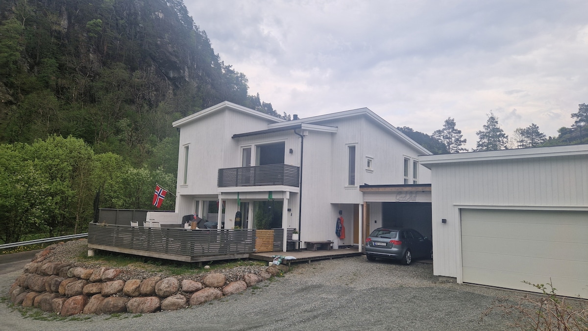 Large home/cabin with fantastic view! You can start your day with a good cup of coffee while enjoying the view of the Norwegian fjords and mountains. The house is centrally located in Sauda with walking distance to cafes, swimming facilities, golf courses, parks, hiking trails etc. In addition, it is only a short drive from Svandalen ski center with its great trails and beautiful hiking areas both summer and winter. In the garden you can enjoy life in different zones for relaxation and coziness.
