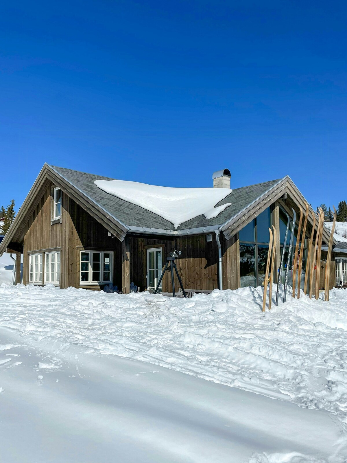 This is a modern, bright, and cozy cabin on one level, with 3 (4 bedrooms), 8 beds, and everything you need for a pleasant stay in the mountains. Two of the bedrooms have fold-down desks - perfect for workation. The modern fireplace will provide both comfort and warmth after a long day in the fresh mountain air. Electricity (ex. EV charging) included in the rent. The cabin is new, from 2022.