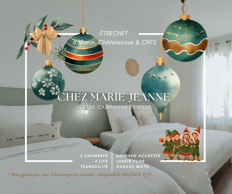 Comme à la maison Chez-Marie-Jeanne ! Un déplacement professionnel à Châteauroux où ses alentours ? Un séjour de vacances aux portes du Pays de George Sand ? Les espaces et l'atmosphère calme et cocooning vous ravira. L'hébergement est composée de 2 chambres, 3 lits, 1 salle de bain, 1 WC, 1 cuisine, 1 grand séjour, 1 terrasse et 1 jardin clôturé. J'ai confié ma maison à un concierge local, La Conciergerie du Berry qui vous assure un excellent séjour.