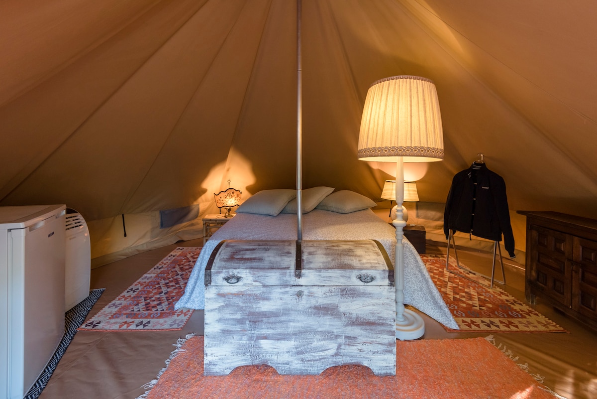 Fuggi dalla routine quotidiana e rilassati sotto un cielo stellato. Le nostre accoglienti tende a campana sono completamente attrezzate e includono la biancheria da letto. All'interno troverete piatti, posate e bicchieri per preparare pasti semplici o cuocere la carne sul barbecue. Portate i vostri ingredienti o acquistate la carne in campeggio. Gli ospiti hanno accesso a servizi igienici e docce in comune, un bar con snack e prodotti di base e un'area relax con amache, tavoli e acqua potabile.