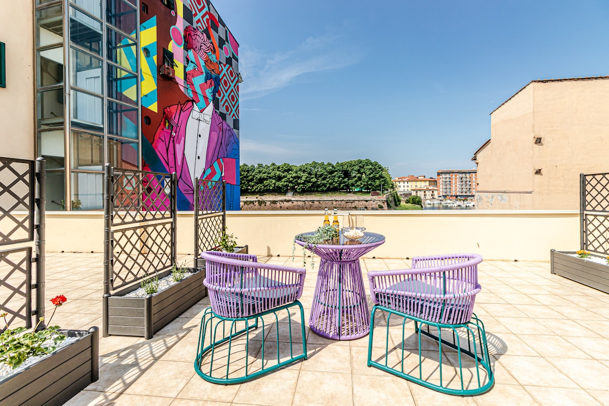 A design oasis on 3 levels, ideal for couples or groups up to 4 people. Fitness, smart working, and influencer-friendly snaps. Be amazed by a breathtaking view on art of graffiti and the neighborhood's canals. The strategic location of the apartment makes it ideal for exploring Livorno on foot, you will be able to quickly reach the historic center, the city center, and the port. You will find numerous supermarkets, shops, restaurants, historical places, and bars nearby. Parking included.