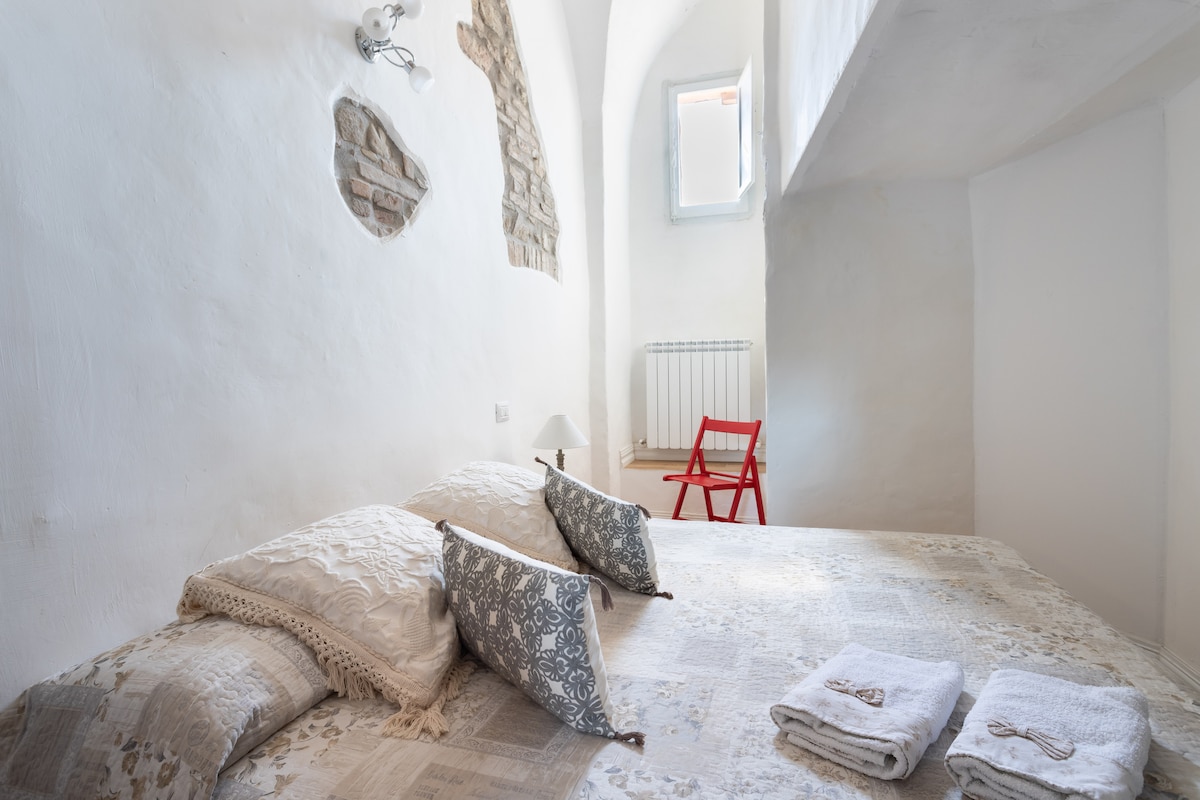 L'appartamento è un monolocale situato ai piedi della bellissima scalinata dell'Acquedotto medioevale che portava l'acqua dal Monte Pacciano alla fontana di Piazza IV Novembre. L'abitazione è incastonata sotto una delle volte dell'acquedotto ed è totalmente indipendente con ingresso autonomo. Vi è l'uso di un angolo cottura con singola piastra ad induzione e viene fornita la biancheria (asciugamani e lenzuola). Vi è un letto matrimoniale e un letto singolo per un totale di 3 posti letto.