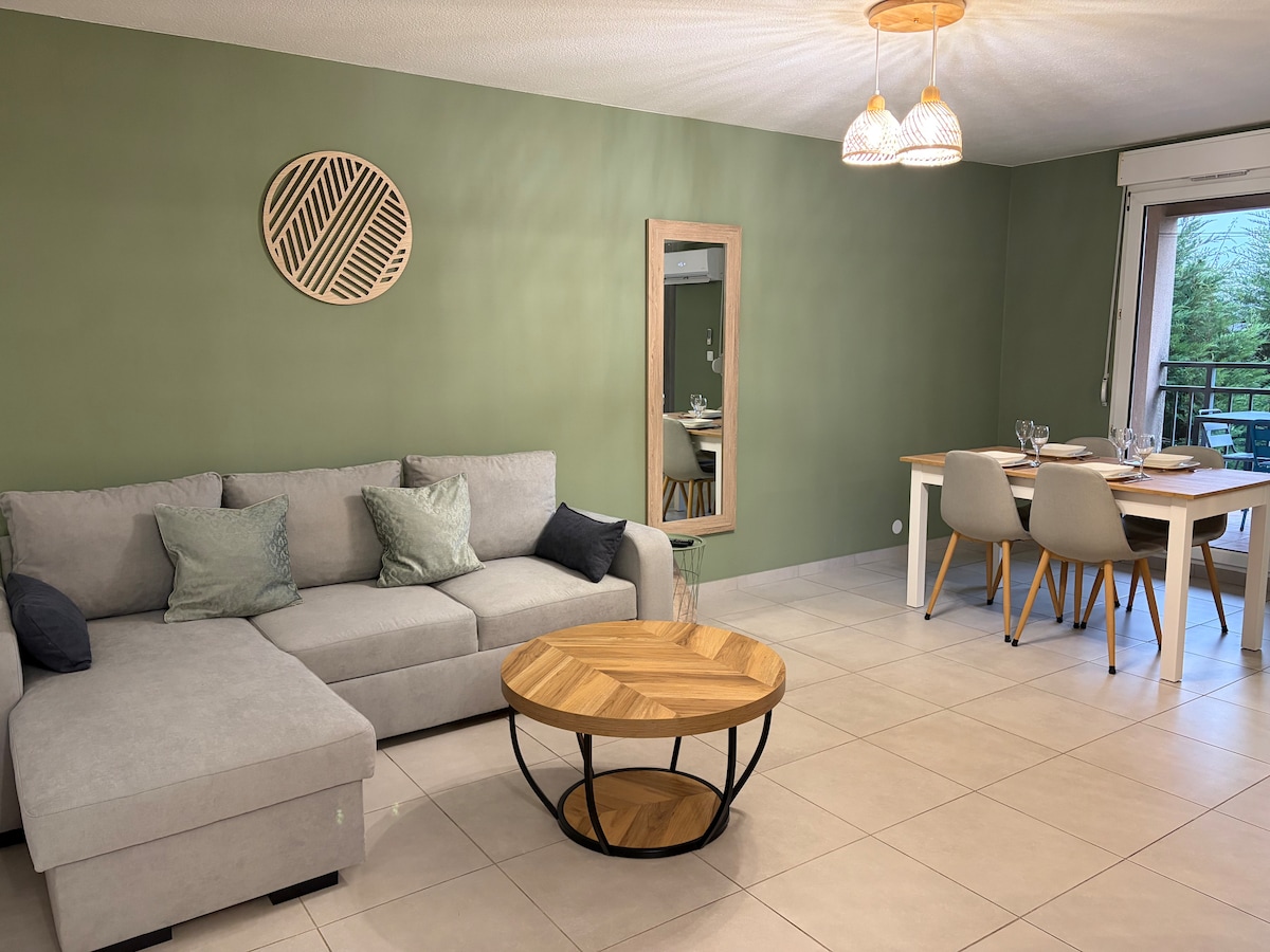 Appartement chaleureux de 37m2 avec entrée individuelle et extérieur au rdc d'une maison. Composé d'une kitchenette avec micro ondes, réfrigérateur/congel, plaque, four Une chambre avec lit king size 180 x200, une TV et une commode. Salle de bain avec douche, WC et machine à laver. Un salon lumineux équipé d'une TV ,WIFI et table d'appoint pour le coin repas. Un canapé convertible 140x190 cm permet un couchage supplémentaire pour 2 personnes. Linge de lit et serviettes de toilette fournis.