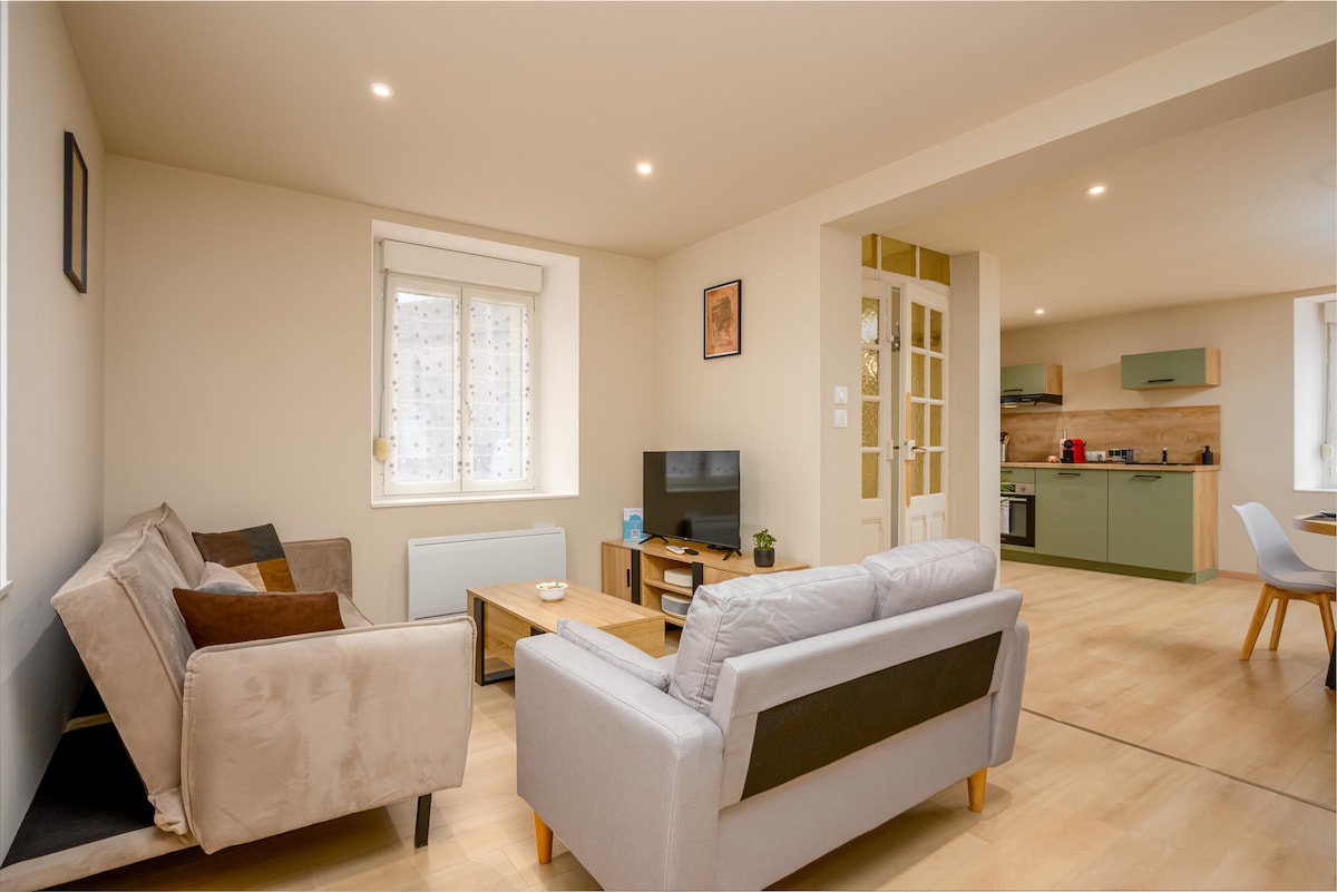 Bienvenue à Le 60, un appartement T2 moderne et épuré de 50m², entièrement rénové en 2025 pour offrir un confort optimal. Situé en rez-de-chaussée avec une place de parking privative devant l’appartement, il se trouve à seulement 2 minutes du centre-ville. Vous profiterez d’une cuisine entièrement équipée, d’un Wi-Fi haut débit, et d’une isolation performante pour un séjour agréable et au calme.