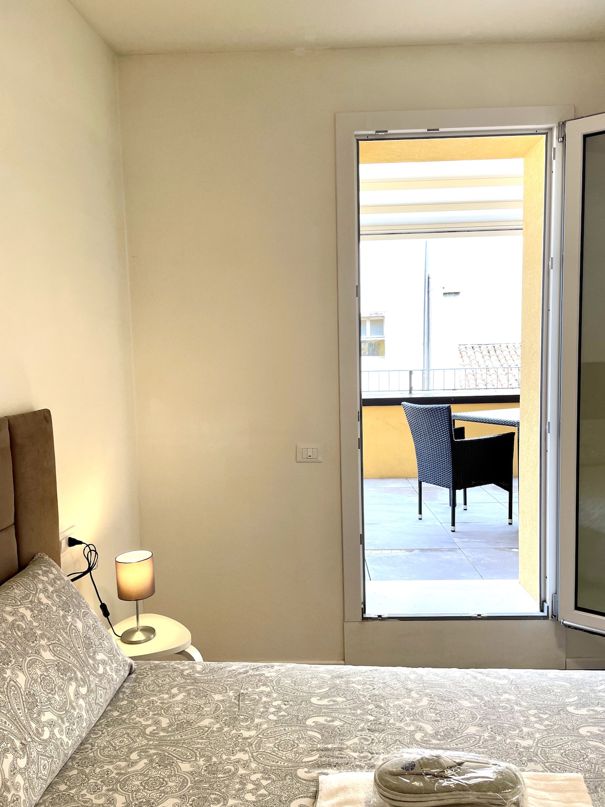 Our home is a bright and quiet apartment on the fourth floor. It is composed by a small entrance, a spacious sunny living room opening on a terrace, a fully equipped kitchen, a bedroom with a kingsize bed and a bathroom. You can relax in the terrace getting a spectacular views on Basilica of Sant'Antonio and Padova's rooftops. Also the location is great! Very close to the pedestrian area in the heart of Padova but also to the trade fair complex, to the Hospital and university areas.