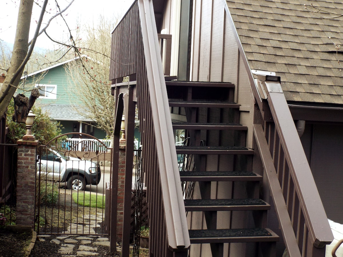 Light and bright studio with second story sleeping loft on a tree-lined street in the popular Jefferson Westside neighborhood. Perfect for 1-2 guests. Walking distance to a variety of eateries, coffee shops, dispensaries and breweries. Quick access to the University of Oregon, Hayward Field and downtown Eugene. The studio is attached to the main house but has a private entrance and offers contact free check in. Queen bed, full bathroom and kitchen as well as wifi, AC and free parking on promise
