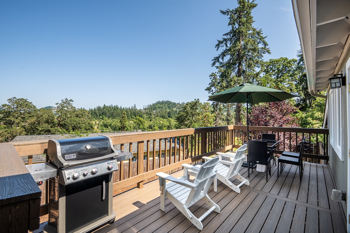 This house is truly a luxurious retreat with a bright artistic flair! It offers total privacy, an amazing view of the valley from its large deck, and a hot tub to relax in at the end of the day. You will feel like you are far out of the hustle and bustle of the city, yet you are less than 20 minutes away from Downtown Eugene. This is the perfect getaway for you, your family, and your friends!