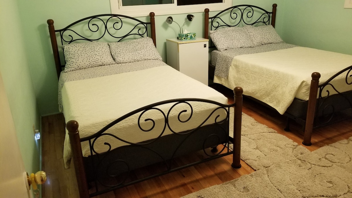 This bright 770 sq ft suite consists of the entire upstairs of my home with two spacious bedrooms with queen beds, a large family room with a queen sofa bed, and bathroom with double sinks and tub/shower. There is no kitchen, but includes an apartment size fridge, microwave, coffee maker, instant pot, and convection oven/air fryer. I provide breakfast (yogurt, fruit, granola, cereal, coffee, tea, cream). Guests enter through the shared front door of the house, and head upstairs to the suite.