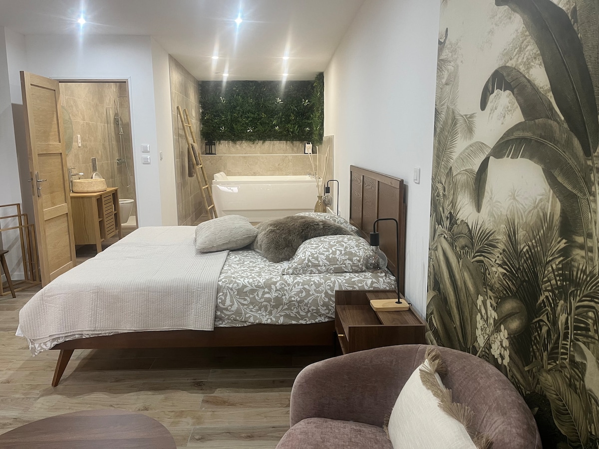 Charmant meublé de 35m² en rez-de-jardin, terrasse, jardin privatif ensoleillé. Situé à seulement 400m des Thermes et à proximité immédiate du centre du village et des commerces accessibles à pied. ✅ tout confort pour 4 personnes ✅ 1 chambre lit 180 et canapé convertible 2 places. ✅ Cuisine équipée, télévision, wifi ✅ Abris voiture avec recharge électrique Résidence calme de 4 logements, entourée d’espaces verts et boisés, avec une jolie vue sur le village.