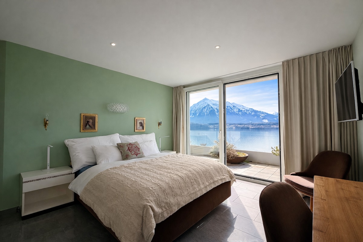Wohnen über dem See – mit freiem Blick auf den Niesen und den Thunersee. In erhöhter Lage in Oberhofen erwartet dich eine stilvolle Rückzugsoase mit grosser Terrasse und beeindruckender Fensterfront. Licht, Weite und Landschaft verschmelzen zu einem besonderen Wohngefühl. Die Einrichtung verbindet Design mit persönlicher Note – ausgewählte Kunstwerke, teilweise von der Eigentümerin selbst geschaffen, verleihen der Wohnung Charakter. Für Paare und ruhesuchende Erwachsene mit Sinn für Ästhetik.