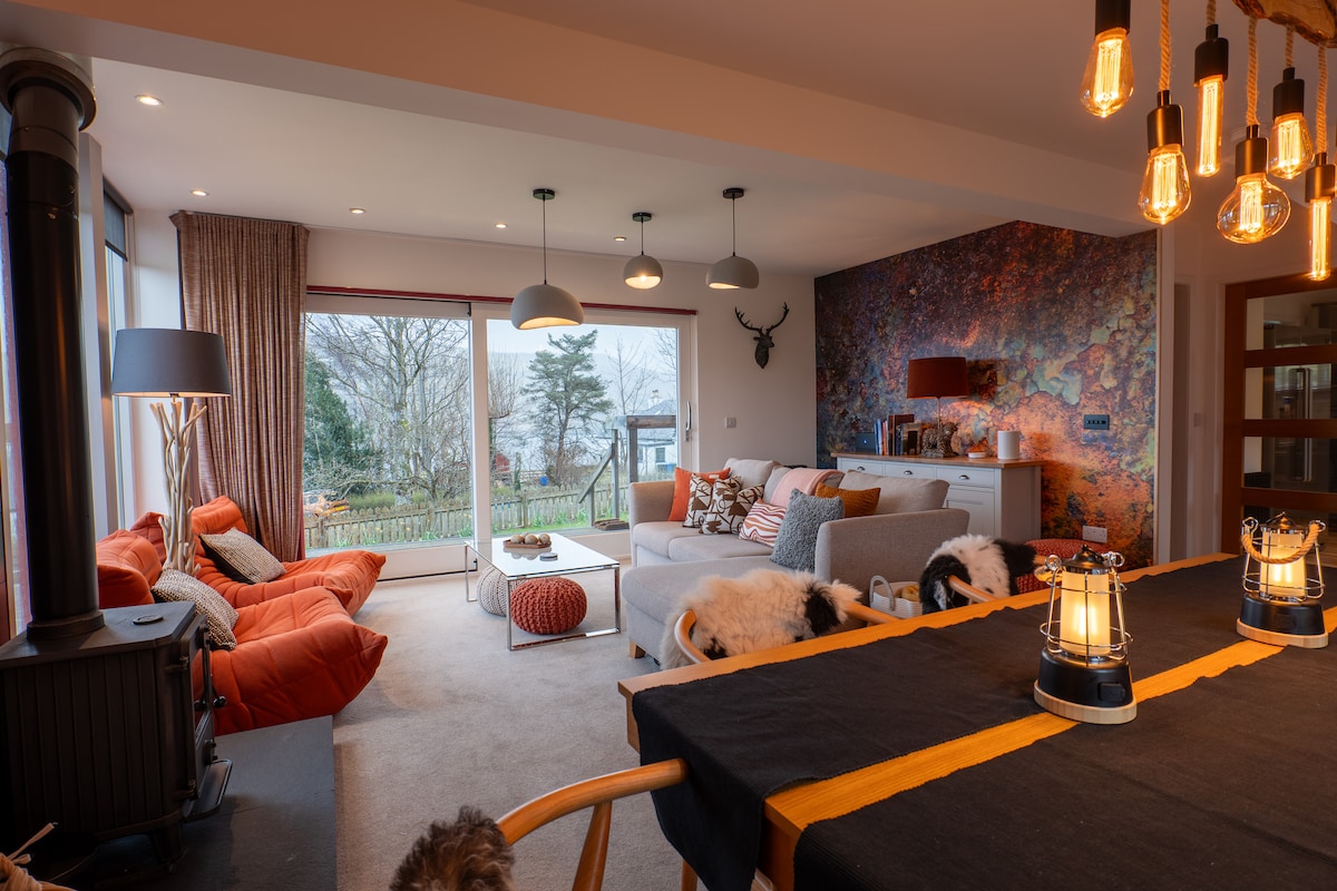 Wake up to sweeping views in the heart of Loch Lomond & The Trossachs National Park—this modern cottage is designed for relaxing group getaways. Step straight from the front door into some of Scotland’s best walking and cycling routes — whether it’s a gentle wander into the village or a full day exploring the surrounding hills and lochs. A short walk to the village of Drymen and 5 mins drive to the beaches of Loch Lomond. Open plan kitchen with panoramic views.