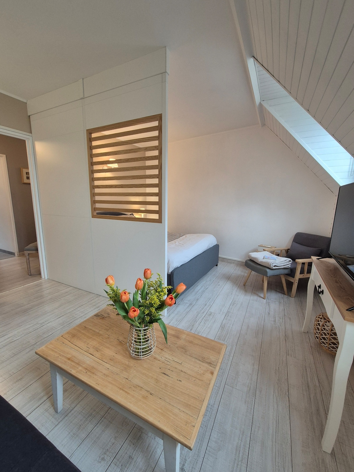 Situé à Chartres, à proximité immédiate de la collégiale Saint-André, cet appartement offre une vue imprenable sur un joyau historique. Entièrement rénové, il allie calme et confort moderne dans un quartier chargé d'histoire. Profitez d'une expérience unique grâce à la baignoire balnéo, parfaite pour vous détendre après une journée de découverte ainsi que d'un vidéoprojecteur pour vos moments films. L'endroit idéal pour une escapade tranquille et enrichissante.