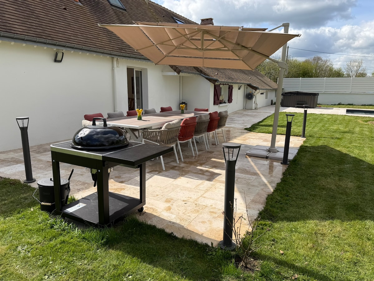 Bienvenue chez nous et faites comme chez vous. Maison pour 8-10 pers (voir plus si supplément) sur 230m2, située à un peu plus d’1h de Paris et à 10min de Center parcs Jardin de 2500 m2 : -SPA 5 personnes -piscine 7m32x3m66 avec une profondeur d’1m32 -Espace enfant composé d’un trampoline enterré, de 2 jeux avec balançoires et de deux cages de foot. -terrain de pétanque de 14 mètres de longueur -préau de 80m2 -table de ping pong -parking privé Pas de frais de ménage, ménage par vos soins.