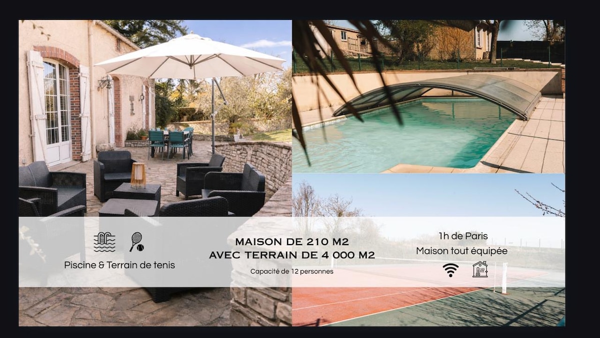 距离巴黎1小时车程的带泳池和网球场的房子,可住12人