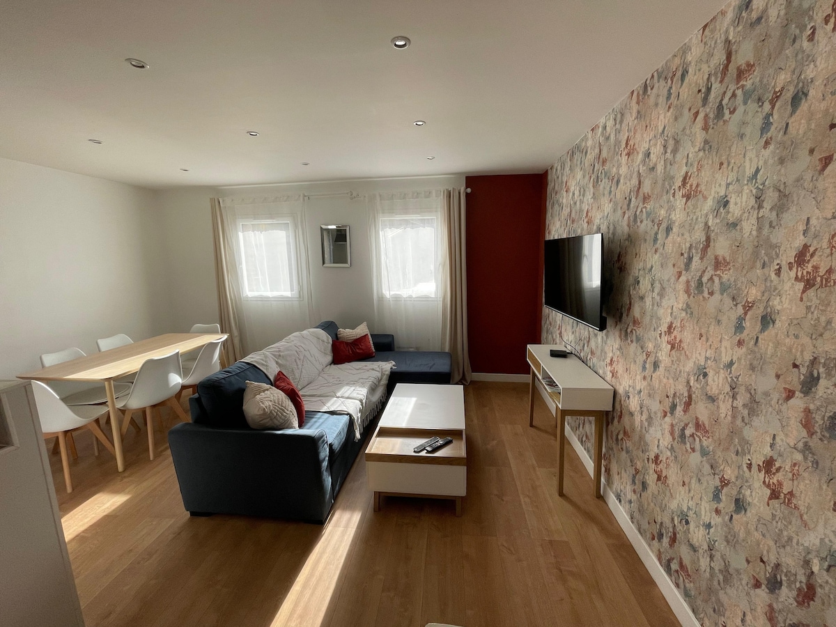 Ce logement familial en centre ville, d'un peu plus de 70m2, est proche de tous les sites et commodités. Très lumineux et paisible, il a été entièrement rénové et équipé de mobilier neuf, très confortable, attention aux détails; Au rez-de-chaussée, vous trouverez un grand toilette avec lave-mains, une cuisine ouverte équipée et un salon / salle à manger. A l'étage, vous trouverez ensuite une grande salle de bain avec baignoire et toilette ainsi que deux chambres. Une double et une double simple.
