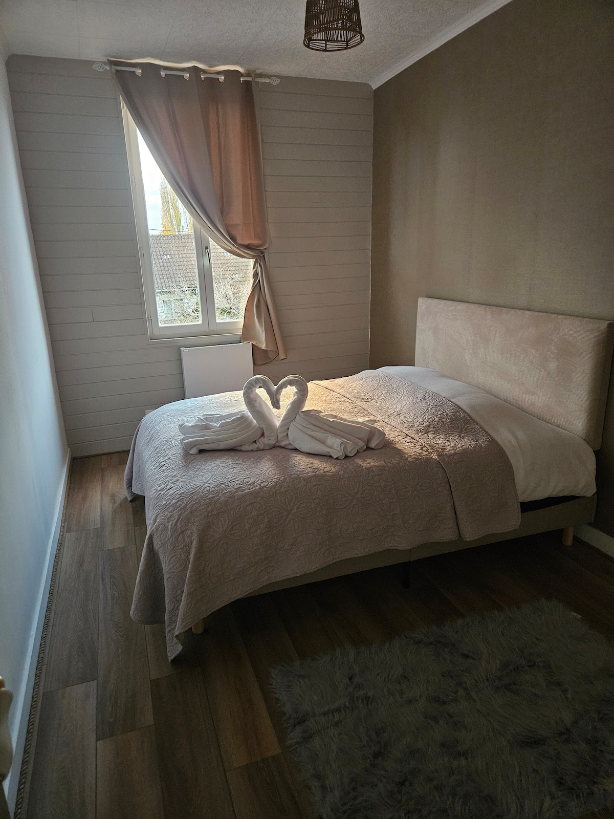 Maison de deux chambres avec un jardin/terrasse clôturée et wifi. 🏠 Idéal pour nos amis à 4 pattes. 🐾 Canapé lit disponible dans le salon. 🛋️ Proche du centre-ville, de la voie verte et de l’office de tourisme. Aire de jeux pour enfants à moins d’une minute derrière l’office de tourisme. 🧩 Place de parking gratuites et protégées par vidéosurveillance de la ville juste en face de la maison. 🅿️ Les serviettes, draps et capsules de café classiques senseo sont fournis. ☕️