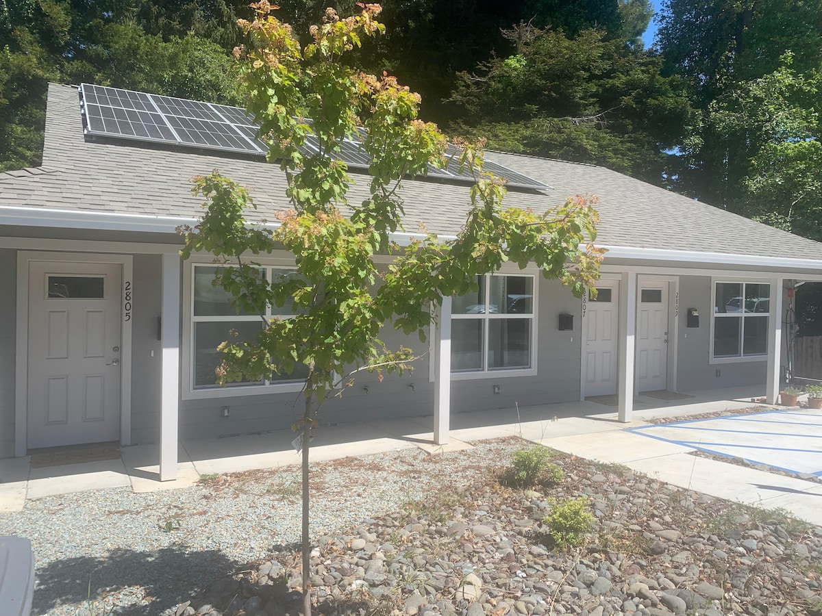 Petite Suite,3 blocks from town, in a circle of Redwoods overlooking orchard,forest. Double bed dressed organic sheets, comforter,and cotton and wool blankets. Clawfoot bathtub/shower with organic towels,Dr. Bronners' soap. Shares porch with hosts,their two sweet dogs,1 super friendly kitty. See property description for abbreviated cooking area description. There are four walls with soundproofing between the two units. Shares property with three other dwellings.