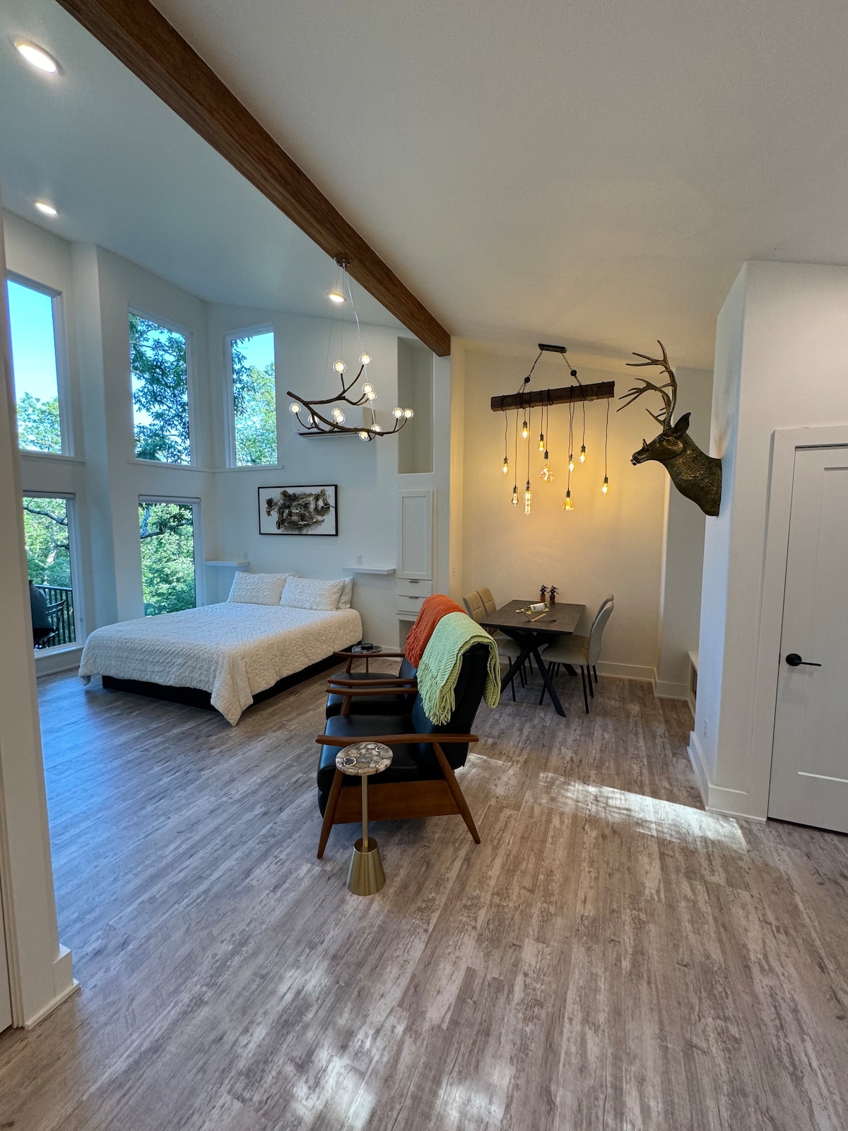 The Perch Lake Lucerne cabin#6 is a one-bedroom, historic, restored, log cabin with a beautiful kitchen, wood stove, deck overlooking Lake Lucerne, only 2 miles to downtown Eureka Springs. You will love the views from all of the windows. Lake view in the living and eat in kitchen and beautiful wooded bluff view out the bedroom and kitchen. You will feel like you are outdoors enjoying nature. Don’t be surprised to have deer outside your bedroom window in the mornings and evenings.