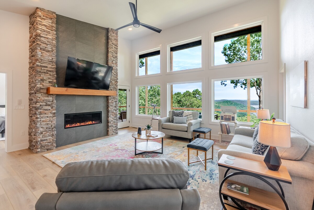 Escape to a brand-new, 2-story treehouse near Beaver Lake! Enjoy nature views from the deck with a recessed stock tank hot tub, stay cozy with an electric fireplace, and cook in the fully stocked kitchen. This unique retreat offers 2 bedrooms (one is a loft accessed by ladder), 3 beds, and sleeps 5. With fast WiFi and a mini-split HVAC system for room-specific climate control, you'll feel secluded yet close to Rogers' attractions. Perfect for a peaceful, modern getaway!