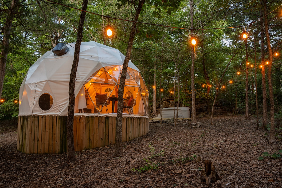 Adventure meets luxury with this one-of-a-kind glamping excursion, as seen on the cover of 417 Magazine! All the best of nature combined with the luxury of an upscale hotel room. Gaze up at the stars, or out at the rolling Eureka forestry from the comfort of your 100% climate-controlled dome. Enjoy the outdoor soaking tub. Cookout on the deck. Drink cocktails from the built-in hammock. 15min to Eureka Springs downtown. 8 min to Beaver Lake/Big Clifty swimming area.