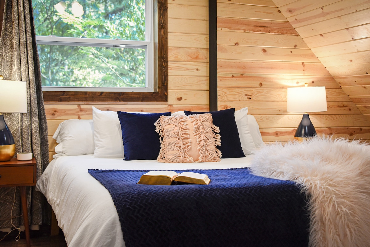 Our cabin is in located one block outside of city limits on a dirt road, nestled in a beautiful forest. Newly renovated cabin, featuring 3 private bedrooms with king sized beds and 2 bathrooms. The downstairs bathroom has a beautiful soaker tub with a shower that features 2 shower heads. This cabin is designed for extreme comfort with luxury linens and a fully stocked kitchen. In addition, the cabin offers a large game room fully stocked with all of your favorite board games and a shuffle board.